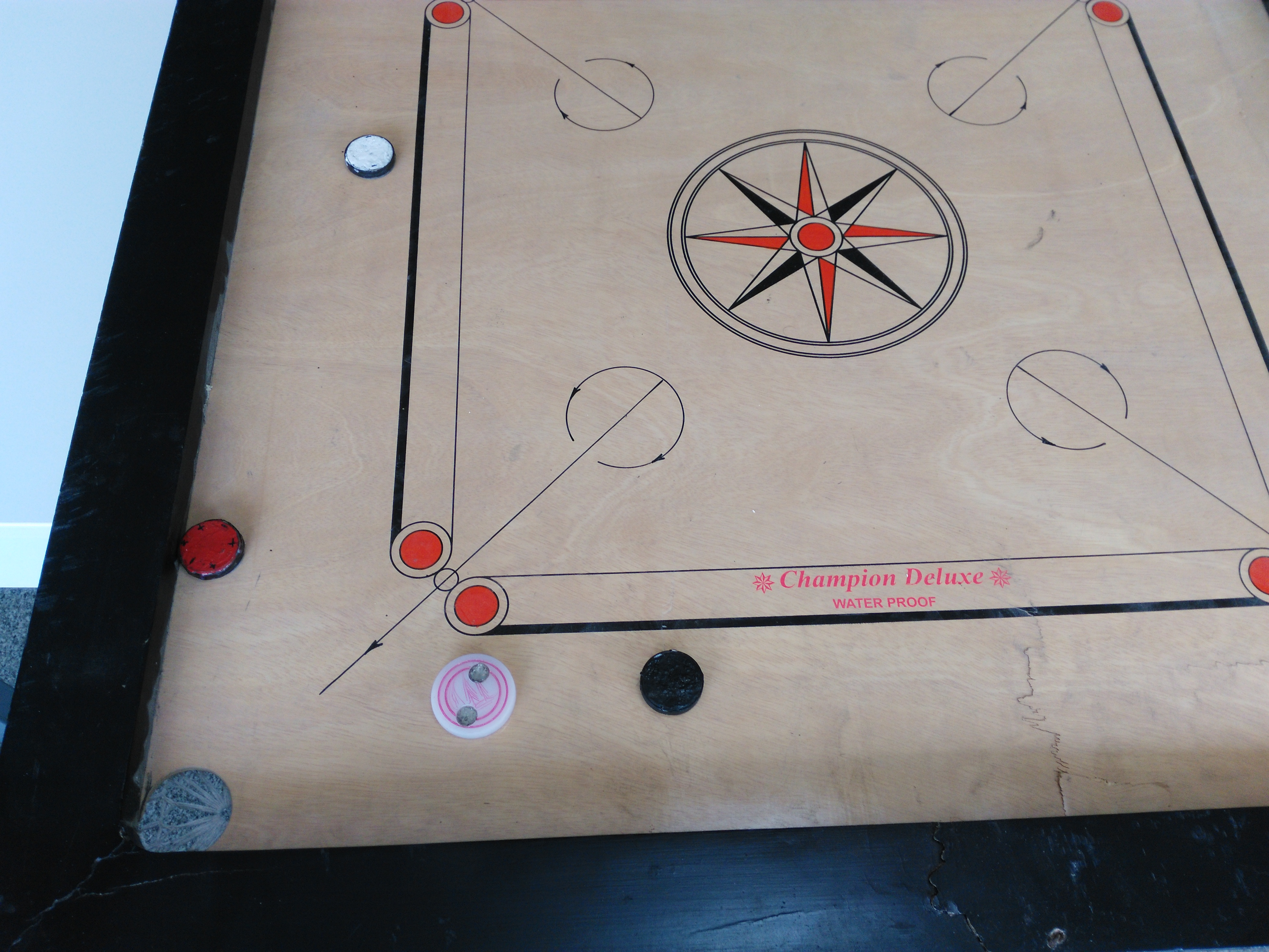 1) Hit the 3-piece collection with the striker hard, and separate all the coins, and play like normal carom. But then, unless the white player is very lucky, and pockets either the Rani, or white, the turn is lost. Black has an advantage, since now the coins are separated, and normal carom can be played.