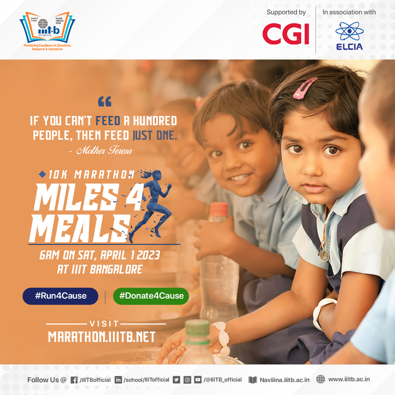 Join us for a race that's not just about winning, but also about supporting a great cause! The Miles 4 meals Marathon is being organised by IIITB in collaboration with CGI and ElCITA on April 1, 2023, and we need your help to make it a success. Lace-up your running shoes and join us on the starting line for a fun-filled day of fitness, community, and fundraising.